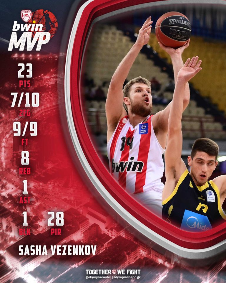 Απέναντι στον Άρη ο Σάσα Βεζένκοφ ήταν ασταμάτητος! Με 23 πόντους και αξιοζήλευτα ποσοστά ευστοχίας (7/10 δίποντα, 9/9 βολές) αποτέλεσε τον πρώτο σκόρερ της «αρμάδας» του Γιώργου Μπαρτζώκα, κατεβάζοντας και 8 ριμπάουντ, με 1 ασίστ και 1 μπλοκ, και συνεισέφερε τα μέγιστα σε πολλούς τομείς της στατιστικής. Γεγονός που τον ανέδειξε σε πολυτιμότερο παίκτη του αγώνα. Με τον φοβερό Σάσα να «ζεσταίνεται» ενόψει των επερχόμενων πλει – οφ της Ευρωλίγκα που θα βρει τον Ολυμπιακό αντιμέτωπο της Φενέρμπαχτσε.
