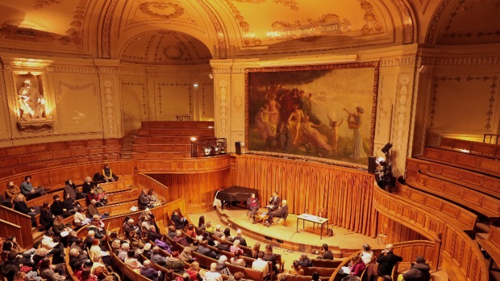 Κατάμεστο το αμφιθέατρο Richelieu του ιστορικού πανεπιστημίου της Σορβόννης, το βράδυ της Δευτέρας 15 Ιανουαρίου, για την εκδήλωση «L'héritage des mythes» με θέμα τους αρχαίους ελληνικούς μύθους στις τέχνες και τα γράμματα, που διοργάνωσε το Ελληνικό Ίδρυμα Πολιτισμού στο Παρίσι, σε συνεργασία με το Τμήμα Νεοελληνικών Σπουδών του Πανεπιστημίου της Σορβόννης και τον πολιτιστικό οργανισμό Delphys.