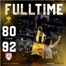 Η ΑΕΚ betsson B.C ηττήθηκε απο τον Ολυμπιακό στο Olympic Hall των Άνω Λιοσίων καθως οι απουσίες της (Κουζμίνσκας τραυματίας και Kabengele αποχώριση) και η αστοχία της στέρησαν το δικαίωμα να διεκδικήσει κατι καλυτερο απο το τελικό 80-92.