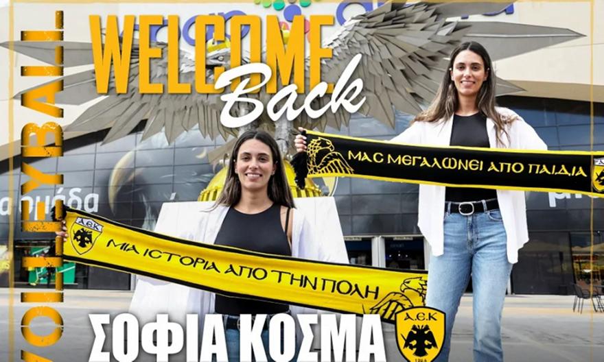 «H AEK βρίσκεται στην ευχάριστη θέση να ανακοινώσει την έναρξη της συνεργασίας της με την Σοφία Κοσμά. Η 29χρονη (15/11/1993) αθλήτρια, ύψους 1,80 μ., υπέγραψε μονοετές συμβόλαιο και επιστρέφει στη γυναικεία ομάδα Βόλεϊ της ΑΕΚ.