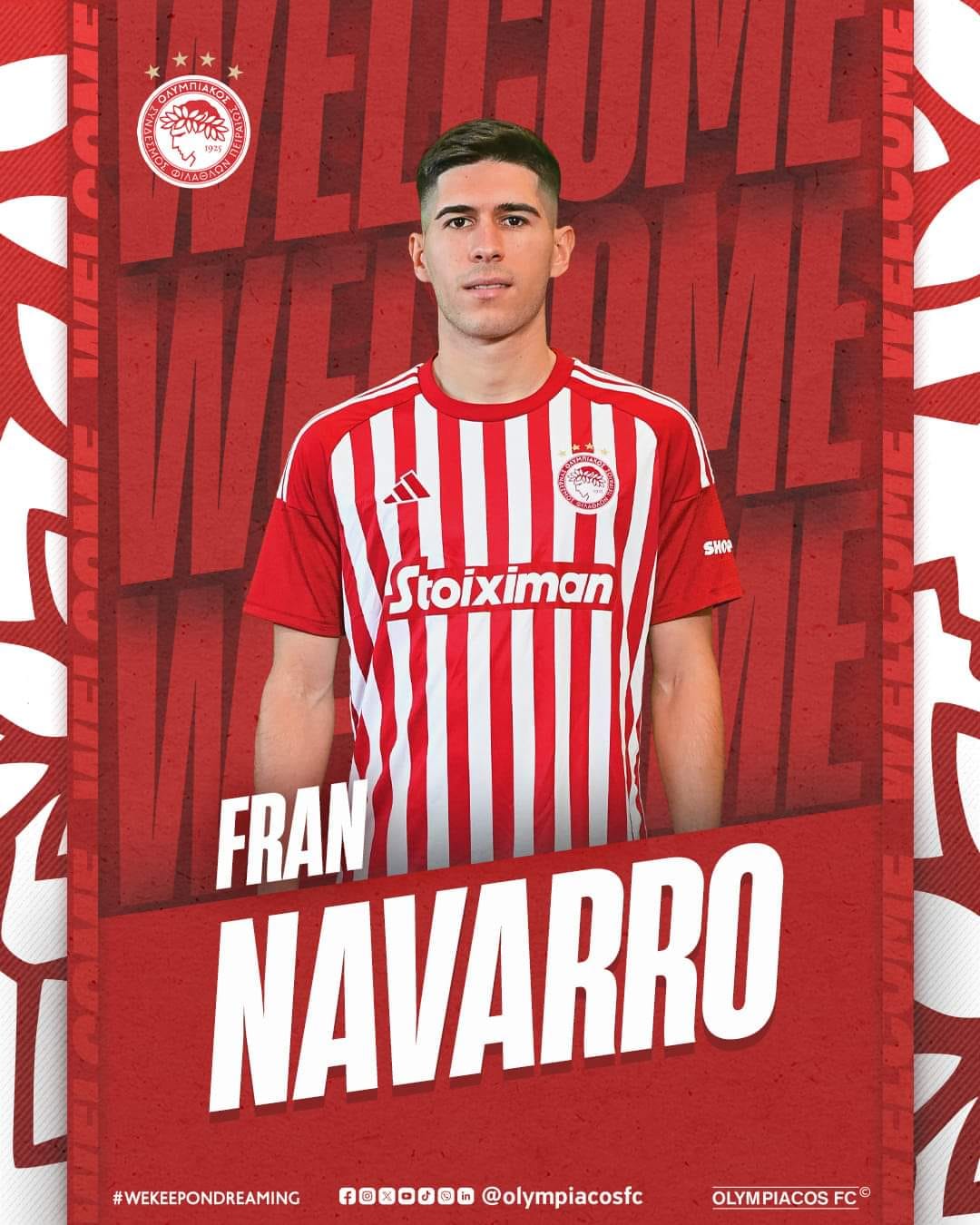 Η ΠΑΕ Ολυμπιακός ανακοινώνει την απόκτηση του Φρανσίσκο Ναβάρο. Ο Ισπανός επιθετικός γεννήθηκε στις 3 Φεβρουαρίου 1998 στην περιοχή Πινέδο, στα προάστια της Βαλένθια.