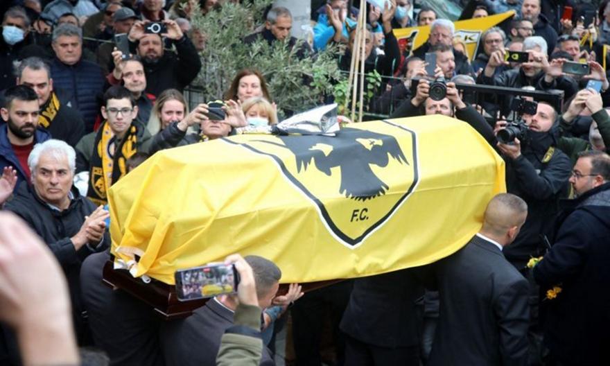 Ολόκληρη η οικογένεια της ΑΕΚ, από ανθρώπους της ομάδας μέχρι απλούς φιλάθλους, συγκεντρώθηκε το μεσημέρι στην Αγία Τριάδα της Φιλαδέλφειας για να τιμήσει τη μνήμη του Μίμη Παπαϊωάννου, που έφυγε σε ηλικία 81 ετών.