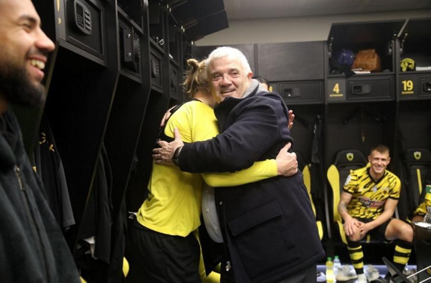 Ο ισχυρός άνδρας της «Ένωσης» κατέβηκε στα αποδυτήρια, όπου μοίρασε μπράβο, ενώ αγκάλιασε έναν-έναν τους παίκτες και αστειεύτηκε μαζί τους ζητώντας να συνεχίσουν έτσι σε πρωτάθλημα και Κύπελλο.