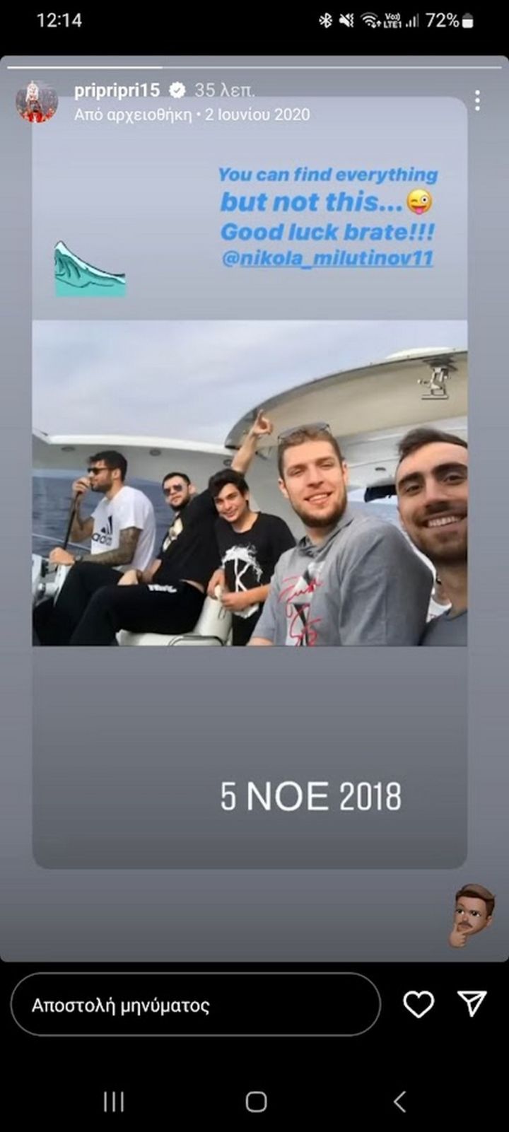 Πέντε χρόνια μετά με ένα σκεπτόμενο emoji ο «Πρι» πόσταρε ξανά τη φωτογραφία, με τον Μιλουτίνοφ δίπλα στους Βεζένκοβ, Παπανικολάου, δίνοντας έτσι έναν τόνο... προφητείας.