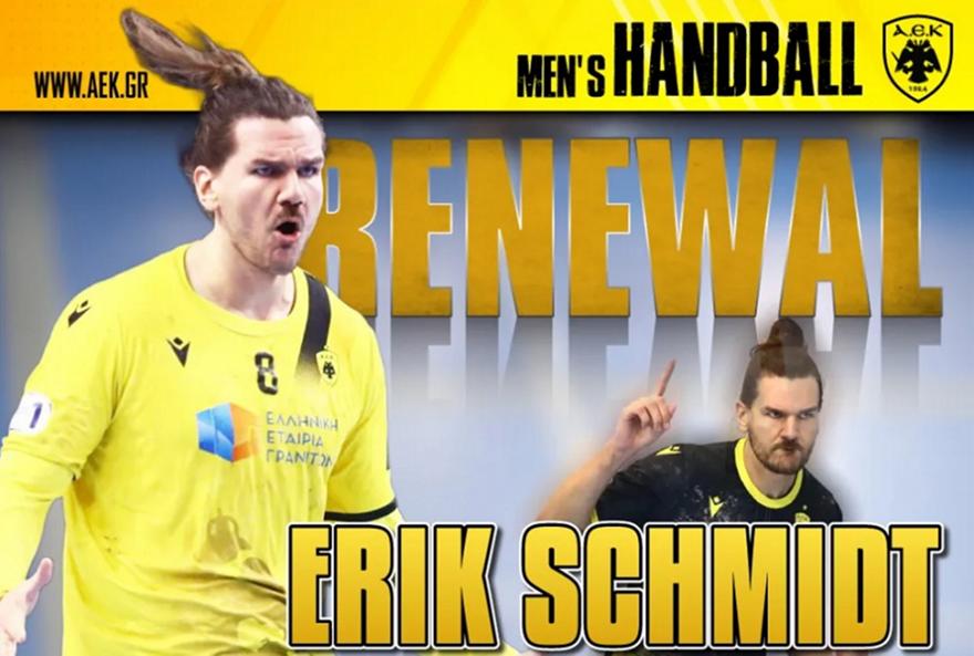 «Η ΑΕΚ βρίσκεται στην πολύ ευχάριστη θέση να ανακοινώσει την ανανέωση της συνεργασίας της με τον Έρικ Σμιντ. Ο 32χρονος (28/12/1992) διεθνής Γερμανός πίβοτ, ύψους 2,06 μ., υπέγραψε το νέο του συμβόλαιο και θα συνεχίσει να ενισχύει το τμήμα Χάντμπολ του Συλλόγου και για τα επόμενα 2 χρόνια.