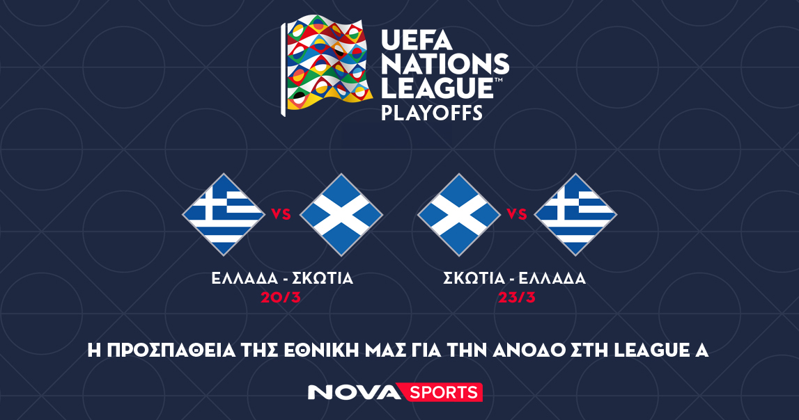 Ο πρώτος αγώνας για το συγκρότημα του Ιβάν Γιοβάνοβιτς, θα διεξαχθεί την Πέμπτη 20/3 (21:45, Novasports Prime) στο στάδιο “Γ. Καραϊσκάκης” ενώ ο επαναληπτικός θα γίνει στην Σκωτία την Κυριακή 23/3 (19:00, Novasports Prime). Και οι δύο αγώνες θα είναι σε περιγραφή του Χρήστου Σωτηρακόπουλου και σχόλιο του Ντέμη Νικολαϊδη. Στο ρεπορτάζ της Εθνικής θα είναι ο Αποστόλης Λάμπος ενώ η εκπομπή UEFA Nations League Tonight με τον Νίκο Τζουάννη θα πλαισιώσει όλους τους αγώνες των Play Offs: Ελλάδα-Σκωτία, Τουρκία-Ουγγαρία, Αρμενία-Γεωργία, Ουκρανία-Βέλγιο, Αυστρία-Σερβία, Κόσοβο-Ισλανδία, Βουλγαρία-Ιρλανδία και Σλοβακία-Σλοβενία.