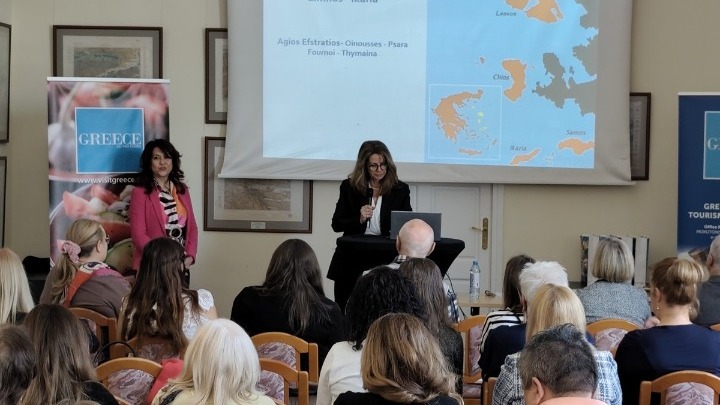 Οι επικεφαλής Διευθύνσεων Τουρισμού Ιονίου και Βορείου Αιγαίου, Μάγδα Λούβρου και Αγγελική Πολιτάκη, αντίστοιχα, παρουσίασαν τους προορισμούς τους, ενώ παρέστη και η προϊστάμενη του Τμήματος Τουρισμού της Περιφερειακής Ενότητας Χίου, Μαρία Κόβα.