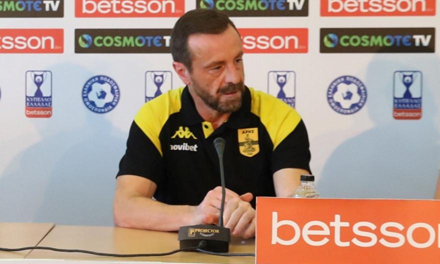Για το γεγονός πως είναι δυο Έλληνες προπονητές στον τελικό: «Νιώθω μια ιδιαίτερη χαρά, γιατί δεν υπάρχει εμπιστοσύνη προς τον Έλληνα προπονητή. Καλό θα ήταν να είχαμε και τον κόσμο, δεν καταλαβαίνω όμως γιατί δεν θα τον έχουμε. Όλα τα άλλα που ακούμε για την ετοιμότητα του γηπέδου, όταν έχεις δυο και τρεις μήνες το φτιάχνεις και για μένα φταίει και η ομοσπονδία και η κυβέρνηση».
