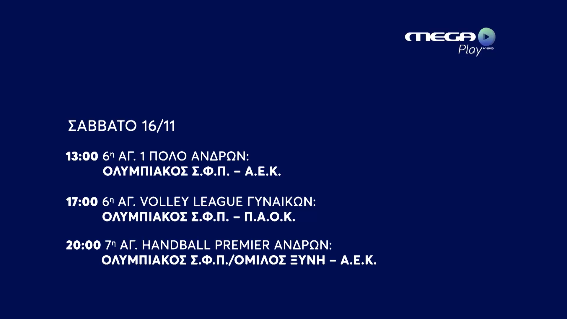 Όλα τα σπορ έχουν κάθε εβδομάδα ξεχωριστή θέση στο MEGA Play, στο megatv.com και στο InSports (in.gr/insports). Το Σάββατο 16 Νοεμβρίου, είναι ημέρα μεγάλων ντέρμπι σε τρία αθλήματα.Στις 13:00 ο απόλυτος κυρίαρχος της πισίνας Ολυμπιακός υποδέχεται την ΑΕΚ στο Παπαστράτειο για την 6η αγωνιστική της Α1 πόλο των ανδρών. Ματς με ξεκάθαρο φαβορί που υπόσχεται πλούσιο θέαμα. Περιγράφει ο Θέμης Σωτηρόπουλος.