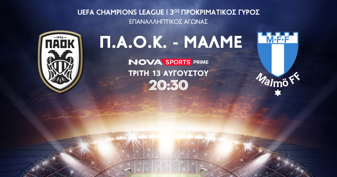 Οι φίλοι του ποδοσφαίρου την Τρίτη 13 Αυγούστου στις 20:30 θα έχουν την ευκαιρία να δουν ζωντανά και αποκλειστικά στο Novasports Prime και σε περιγραφή του Ισίδωρου Πρίντεζη και ρεπορτάζ των Κωστή Μπότσαρη και Αποστόλη Λάμπου τον επαναληπτικό αγώνα του «Δικέφαλου» του Βορρά κόντρα στην πρωταθλήτρια Σουηδίας Μάλμε, για τον Γ’ προκριματικό γύρο του UEFA Champions League. Από τις 20:00 οι φίλοι του ποδοσφαίρου θα μπουν στο ρυθμό του αγώνα με το Pre Game Show σε παρουσίαση του Ισίδωρου Πρίντεζη.