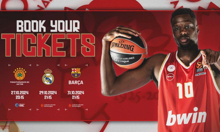 Η Κ.Α.Ε. ΟΛΥΜΠΙΑΚΟΣ ανακοινώνει ότι για τον αγώνα Ελληνικού Πρωταθλήματος Stoiximan Basket League 2024 - 2025 με τον ΠΑΝΑΘΗΝΑΪΚΟ AKTOR 27/10/2024, με ώρα έναρξης 20:15 και για τους αγώνες Euroleague με την REAL MADRID 29/10/2024, με ώρα έναρξης 21:15 και με την FC BARCELONA 31/10/2024, με ώρα έναρξης 21:15 η διάθεση των εισιτηρίων πραγματοποιείται ως εξής: