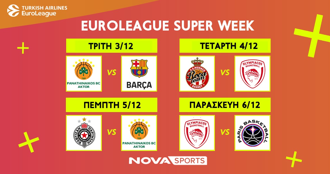 H «Διαβολοβδομάδα» Νο4 της EuroLeague, της κορυφαίας ευρωπαϊκής διασυλλογικής διοργάνωσης στο χώρο του μπάσκετ, έρχεται αυτή την εβδομάδα στο παρκέ του Novasports! Τα φώτα πέφτουν στις αναμετρήσεις των ελληνικών ομάδων Παναθηναϊκός AKTOR-Μπαρτσελόνα (3/12, 21:15) & Μονακό-Ολυμπιακός (4/12, 20:00) για την 13η αγωνιστική και Παρτίζαν-Παναθηναϊκός AKTOR (5/12, 21:30) &  Ολυμπιακός-Παρί (6/12, 21:15) για την 14η αγωνιστική. Η απόλυτη μπασκετική εκπομπή, Playmakers θα μεταφέρει όλα όσα συμβούν και στις δύο αγωνιστικές με την πληρέστερη και αρτιότερη δημοσιογραφική κάλυψη και εκλεκτούς καλεσμένους.