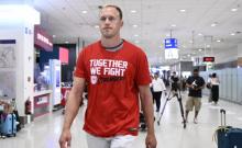 Ο νεοφερμένος Αμερικανός φόργουορντ εμφανίστηκε ιδιαίτερα χαμογελαστός ενώ φορούσε ένα κόκκινο μπλουζάκι των νταμπλούχων Ελλάδας το οποίο έγραφε «μαζί παλεύουμε πιο δυνατοί».